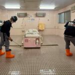 床の汚れ・皮脂・水垢を除去し、下地を整える工程は滑り止め工事の肝です。