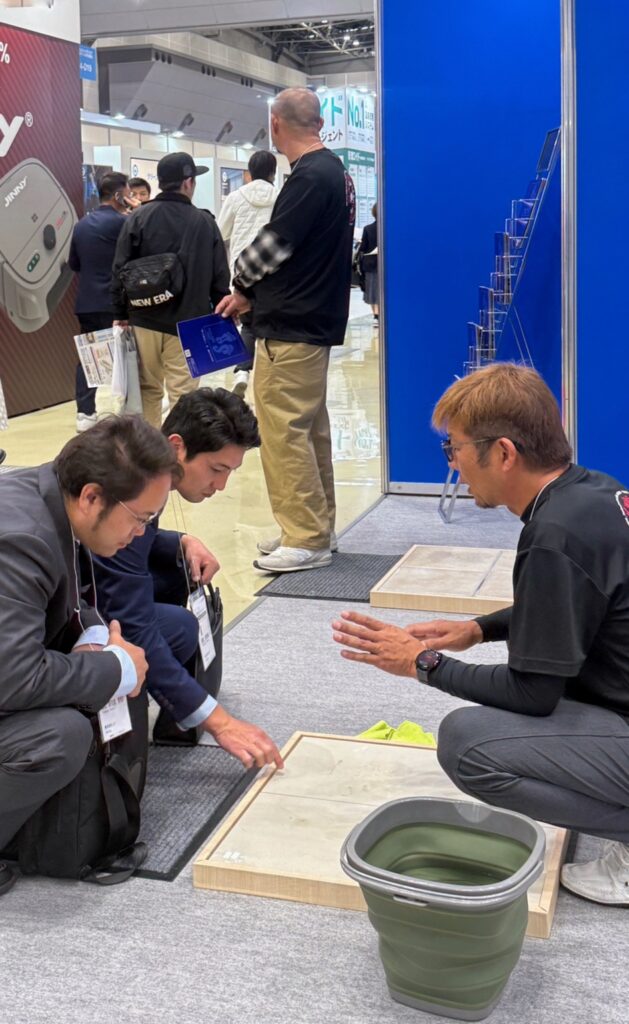 滑りやすさと止まりやすさの違いを、来場者と同じ姿勢・同じ目線で一緒に確かめてもらう。