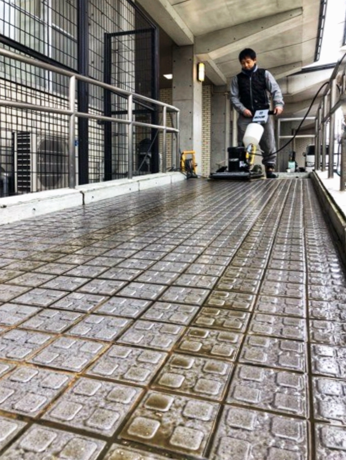 タイル表面に薬剤を反応させ、ブラシで丁寧に洗い、