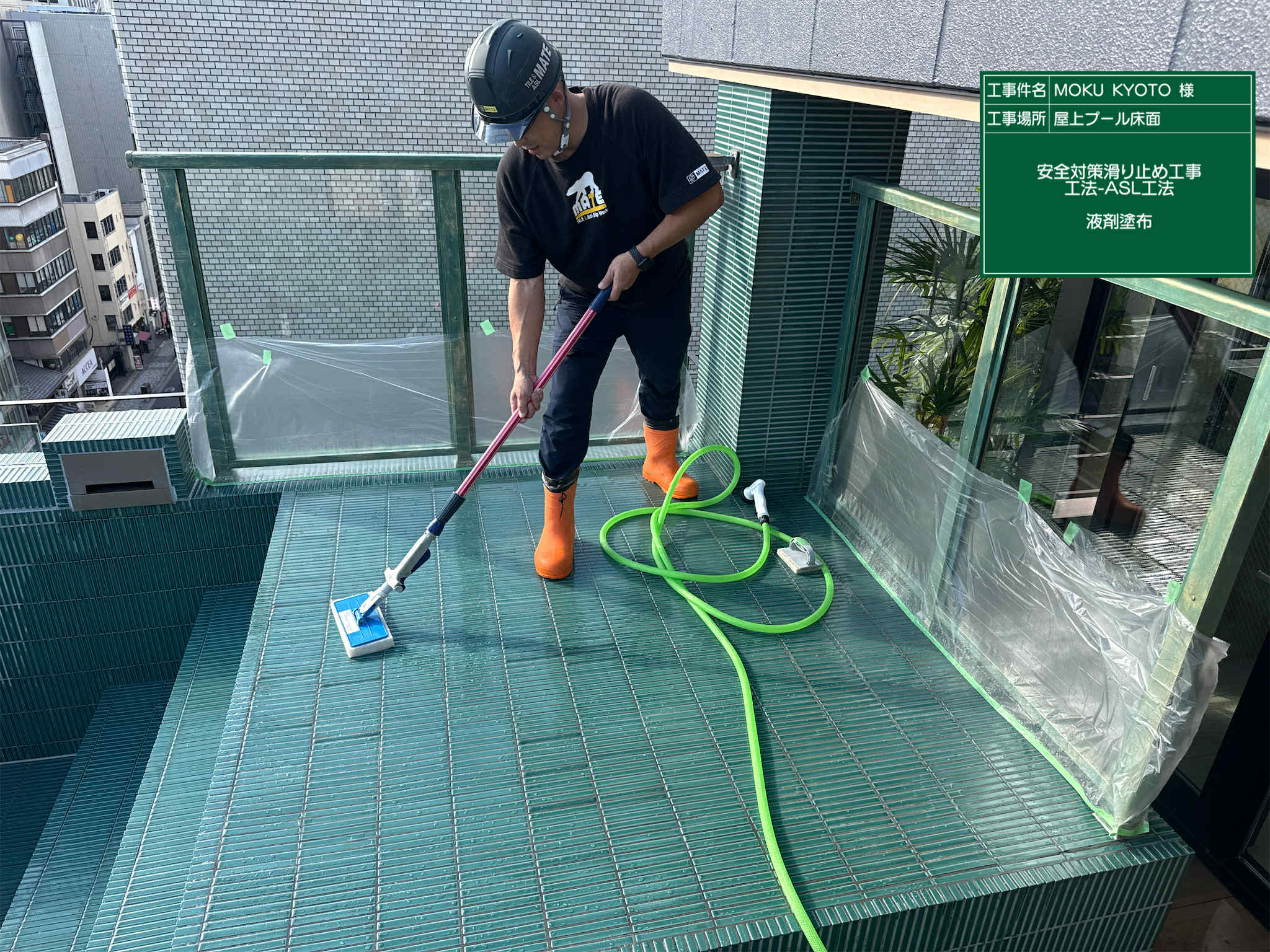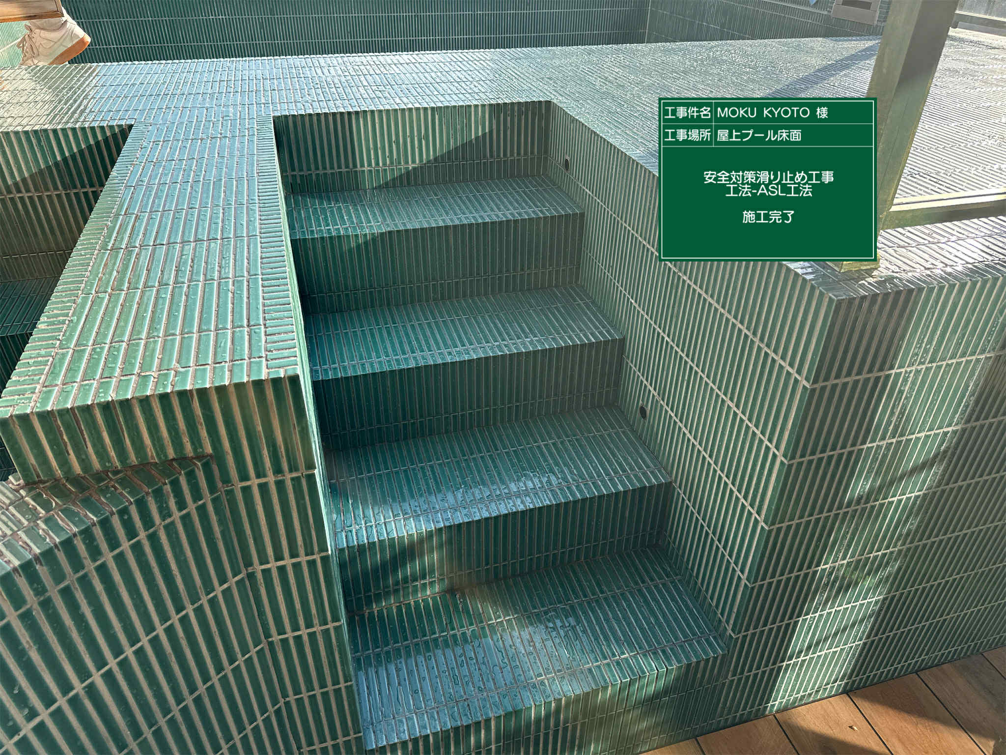 屋上プール床タイル面にも滑り止め工事ASL工法が採用されています
