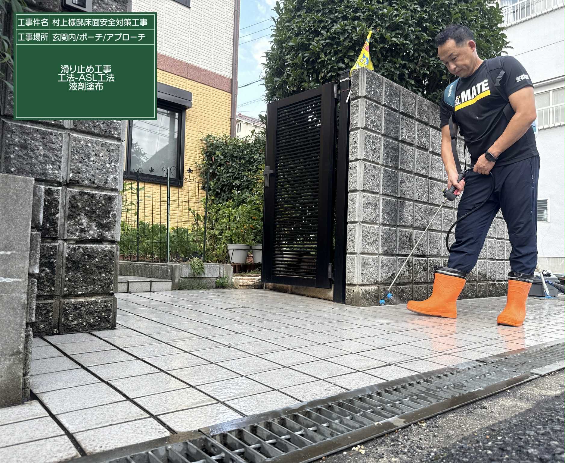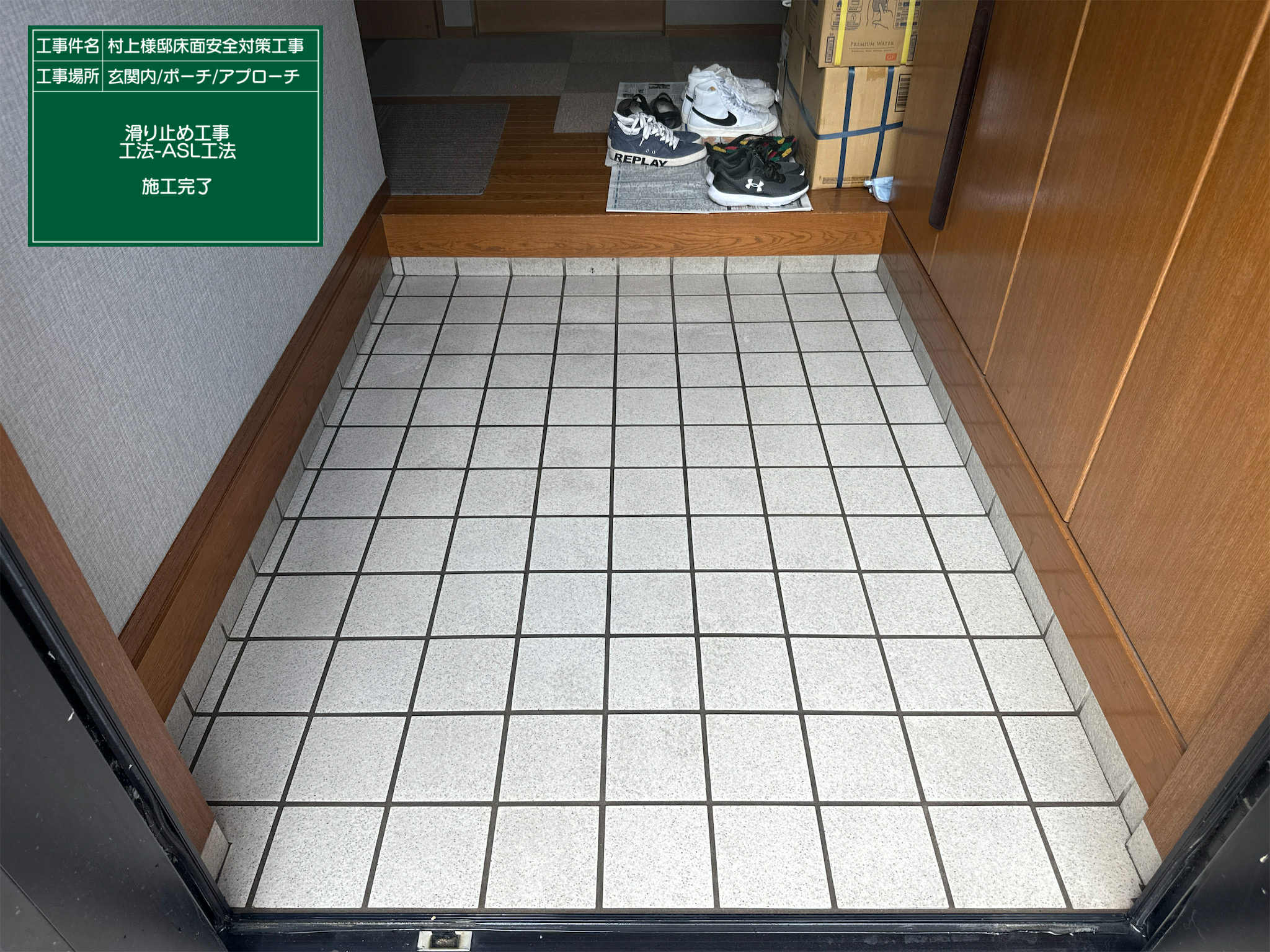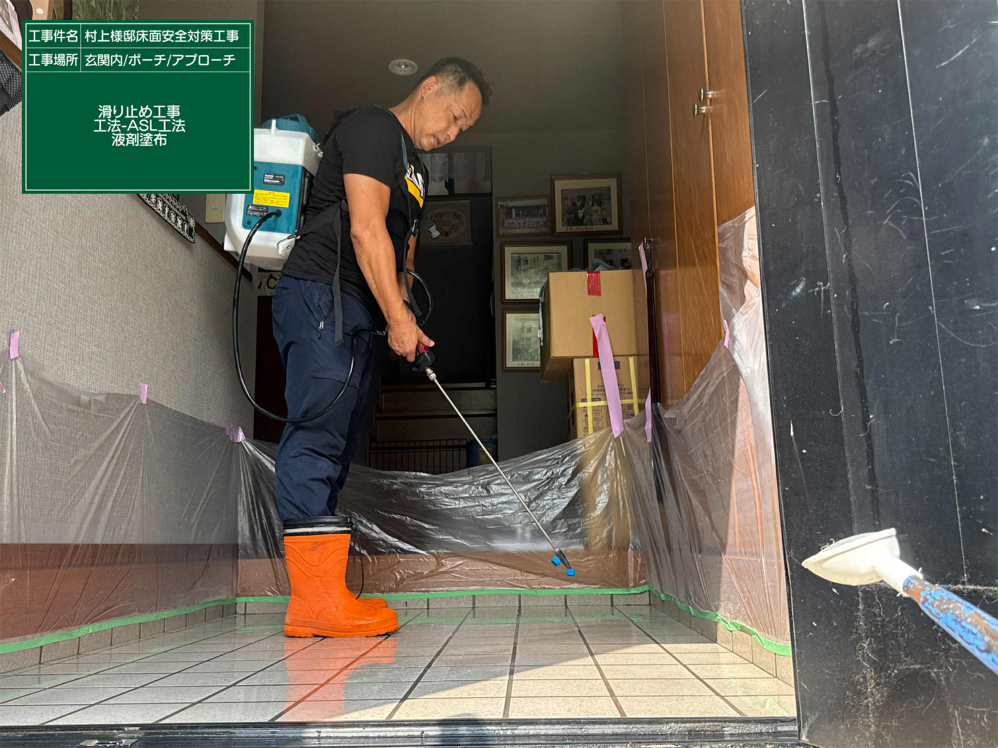 工事内容: 介護保険対応・安全対策滑り止め工事工 法:滑り止めASL工法対象床材:150角磁器タイル【転ばぬ先を、家族のために。】介護保険を使って玄関ポーチの滑り止め工事を行いました。門扉から続く長いアプローチの床は、雨の日になると「怖くて出かけるのが億劫になる」と仰られていました。毎日の出入りが“安心”に変わる――その一歩を支えるのが、僕たちのASL工法です。見た目は変えず、足裏の安全だけをアップデート。
